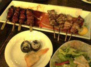 造り盛り合わせ、肝と身の焼鳥、サラダ、ニラ饅頭、といった