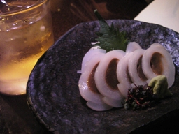 イカの肝をイカの身で巻き、凍らせてスライスしたもの。