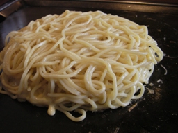 続いてやきそばの麺をのせて、片面焼けたらひっくり返し、